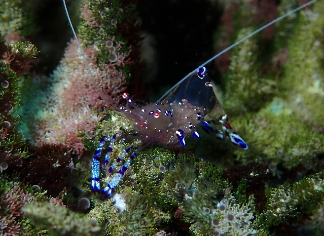 On the same dive I found another treasure. A 4" Mantis Shrimp, i think it's a Pink Eared Mantis Shrimp (b/c of the pink ears...duh). I only spotted him because he 'attacked' me .... Mantis shrimp are able to club prey with the force of a bullet, or spike them with their sharp claws, this was a 'stabber' They are so beautiful !